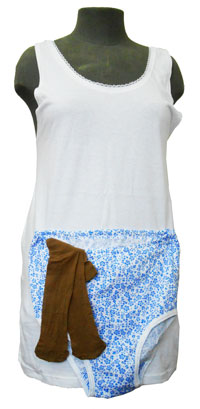 В комплект женского белья для умершей входит белая трикотажная майка с кружевом, трикотажные трусы с цветочным принтом и получулки телесного цвета.
