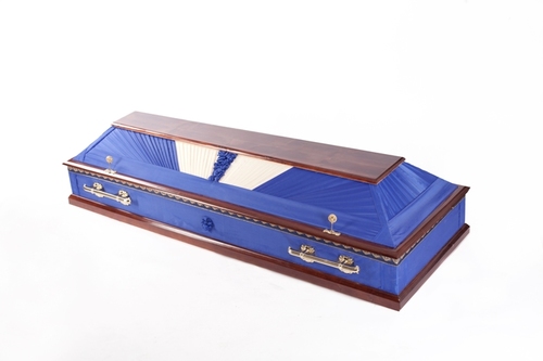Деревянные элементы комбинированных гробов в глянцевом исполнении, цвет - орех. Тканевые элементы выполняются в синем цвете.